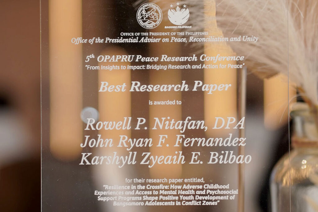 Dr. Nitafan and his team’s study, titled “Resilience in the Crossfire: How Adverse Childhood Experiences and Access to Mental Health and Psychosocial Support Programs Shape Positive Youth Development of Bangsamoro Adolescents in Conflict Zones,” was among the selected papers under the theme “Reintegration, Resilience, and Human Development in Post-Conflict Mindanao.”